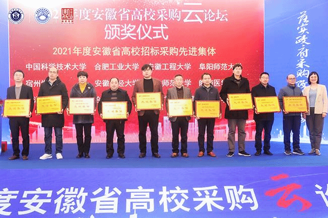 本次论坛以“落实政府采购改革制度,促进高校采购优质发展”为主题,安徽省财政厅政府采购处副处长杜荣胜做了“政府采购制度改革和徽采云平台介绍”专题讲座,安徽省教育厅监审处处长廖文秋出席会议并为“2021年度安徽省高校招标采购先进集体”颁奖。