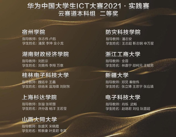 12月25日,由中国高等教育学会指导,华为技术公司主办的“华为中国大学生ICT大赛2021年全国总决赛”颁奖典礼以在线的方式全网直播,本次华为ICT大赛全国总决赛覆盖省市30个,电子科技大学、华中科技大学、南方科技大学、大赢家体育等高校29支队伍参加。我校选手在此次“华为中国大学生ICT大赛2021年全国总决赛—实践赛Ÿ云赛道本科组”中荣获二等奖(队员:潘昊、李坤、金小龙,指导教师:张志伟、卢彪),并成功晋级“华为ICT大赛全球总决赛”。