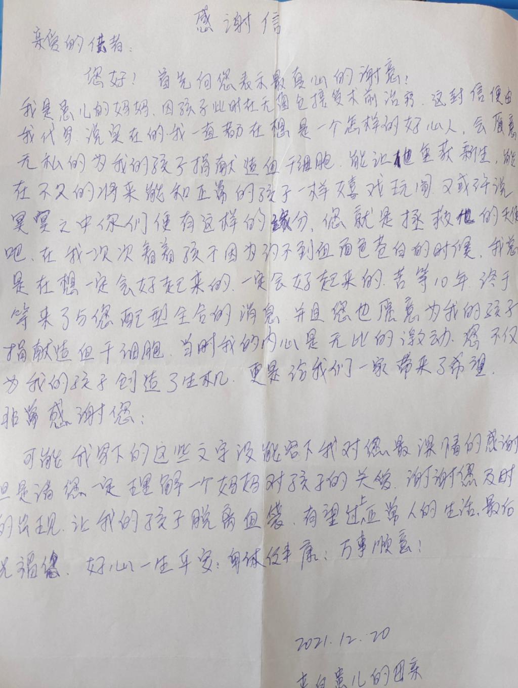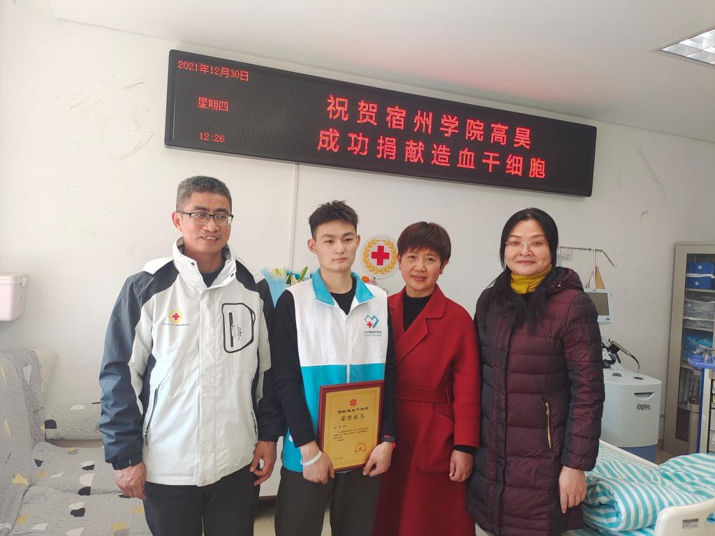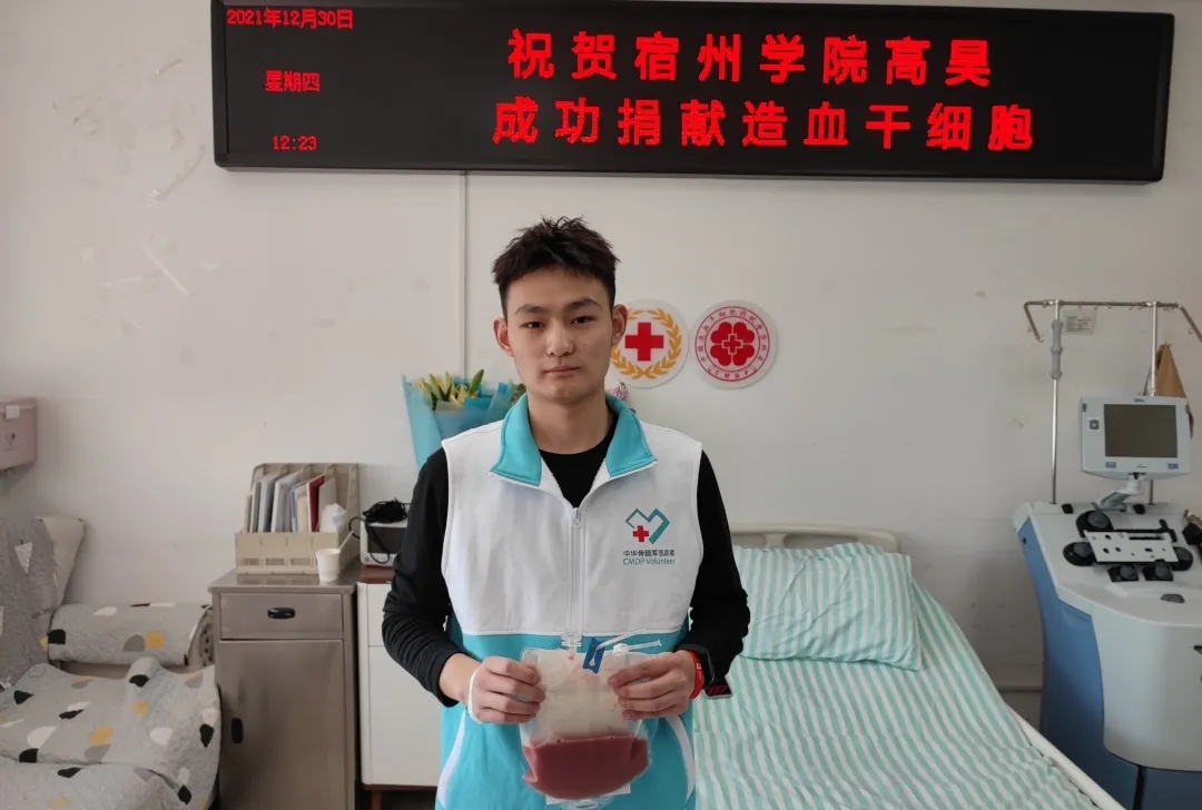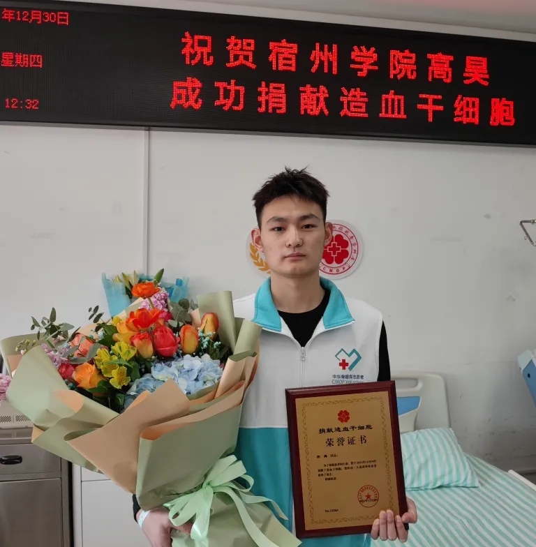 “我一直都在想,是怎样的好心人,会愿意无私的为我的孩子捐献造血干细胞,能让他重获新生......您就是拯救他的天使。”12月30日,一封饱含感激之情的信件,到达了我校机械与电子工程学院2018级通信工程专业学生高昊的手上。这一天,一场感人的生命接力在安徽省立医院上演。21岁的“00后”高昊成功捐献288毫升造血干细胞混悬液,为一名罹患地中海贫血的11岁小患者送去了生的希望,是寒冬中的暖阳。他也成为了中华骨髓库第12564例,宿州市第20例、我校第3例造血干细胞捐献者。