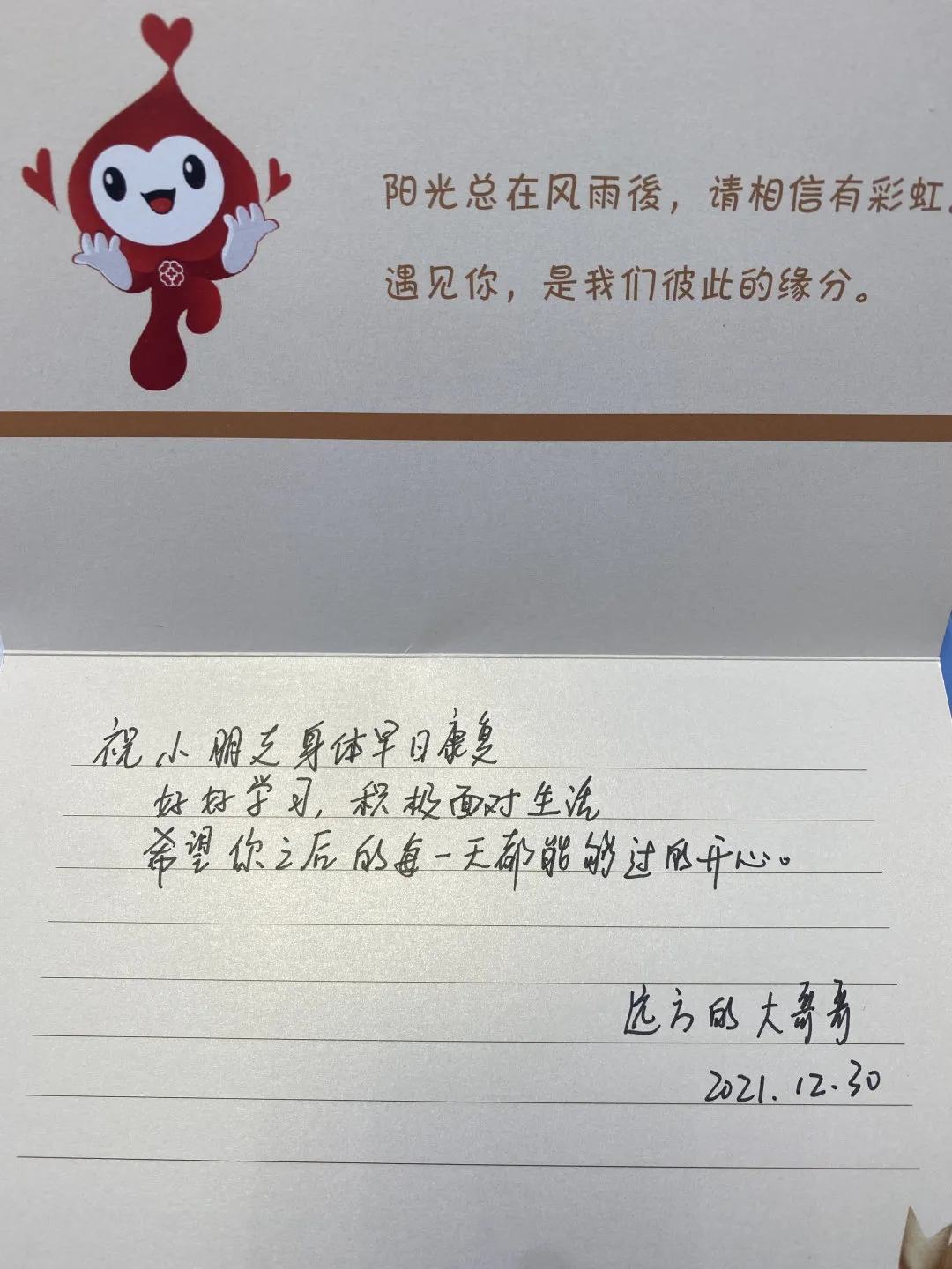 在焦急的等待中,10月13日,高昊接到安徽省红十字会重启捐献的通知,紧接着进行的捐献前的体检也合格。12月8日,高昊终于等来了捐献通知,12月25日赴安徽省立医院做相关准备,12月30日正式捐献。5天住院期间,高昊每天注射2针造血干细胞动员剂,用于把骨髓中的造血干细胞动员到外周血周围以方便采集。虽然有点腰部酸疼的症状,但是比起挽救一个生命来说,高昊觉得这点短暂的疼痛都不值一提。捐献成功后,高昊很高兴,“能用自己的爱心挽救这个小生命,让受助者获得新生、共享幸福,是一件让人非常开心的事。”随着288毫升造血干细胞混悬液一同送到患者身边的,还有一张高昊写的祝福卡。“祝小朋友身体早日康复、好好学习、积极面对生活,希望你之后的每一天都能够过得开心——远方的大哥哥”。一场爱心的接力,让原本没有血缘关系的两个人,亲如兄弟。