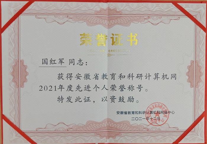 为促进高校信息化建设,推动我省教育信息化快速发展,在省教育厅指导下,安徽省教育和科研计算机网组织开展了“安徽省教育科研网年度优秀主节点”、“安徽省教育科研网2021年度先进单位和先进个人”评选活动。我校荣获2021年度优秀主节点单位,办公室网络中心国红军老师被评为2021年度先进个人。