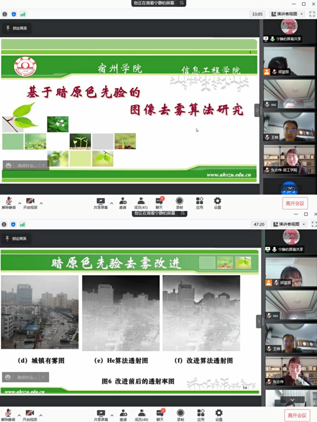 陈黎黎老师根据其在陕西师范大学的访学和科研进展,作了题为基于暗原色先验的图像去雾算法研究的报告。她提到在雾霾环境中,图像会出现退化现象,而造成这种现象的主要原因是光在大气中传播发生了散射作用。由此对大气散射模型、暗原色先验理论、暗原色先验去雾过程以及去雾改进逐一展开了介绍。
