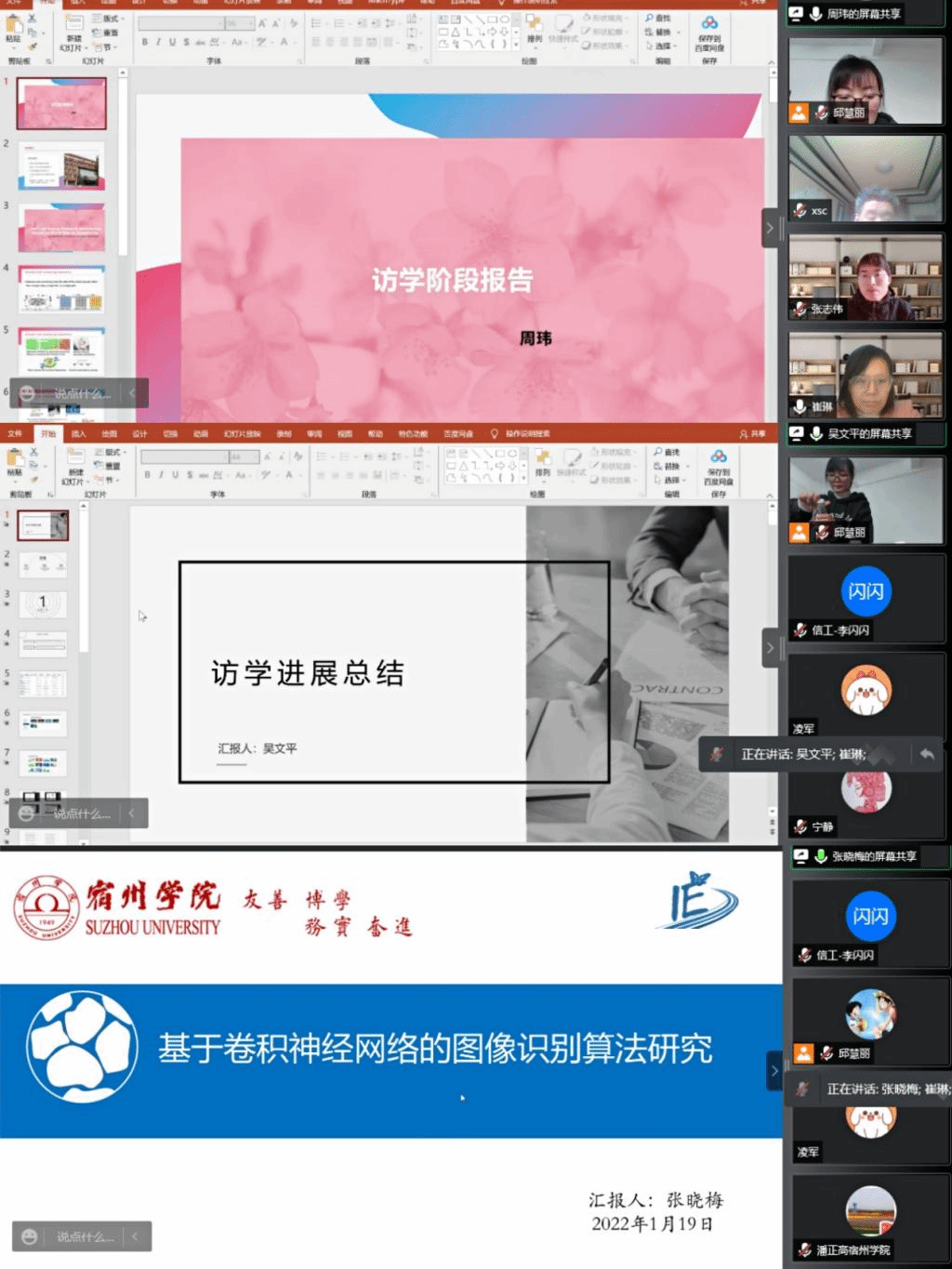 为接触和了解本学科的学术前沿动态,提高学术水平,2022年1月19日下午,信息工程学院成功举办访学教师学术成果线上汇报交流会。信息工程学院李雪竹、陈黎黎、周玮、吴文平、张晓梅共5位访学教师分别进行了访学期间的成果汇报。汇报会由信息工程学院院长许海峰、科研副院长崔琳共同主持,并邀请南京航空航天大学韩守飞、安徽大学叶春明、蚌埠学院李现伟3名博士构成专家小组,现场对汇报人的访学成果进行评审交流,信息工程学院全体教师参加了本次汇报会。