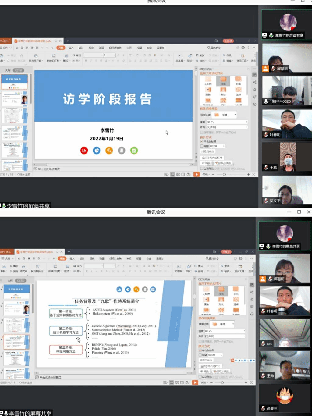 汇报会上,李雪竹老师根据其在中国科学技术大学访学和科研情况,作了大赢家体育中国古典诗歌生成的基础方法、应用系统及开源平台的汇报。她从“九歌”作诗系统的任务背景、系统背后的几个重要模型展开,重点介绍了基于显著性上下文机制的诗歌生成、基于工作记忆模型的诗歌生成、基于互信息的无监督风格诗歌生成三种方法,并展示了该系统模型在实际工作中的有效应用。