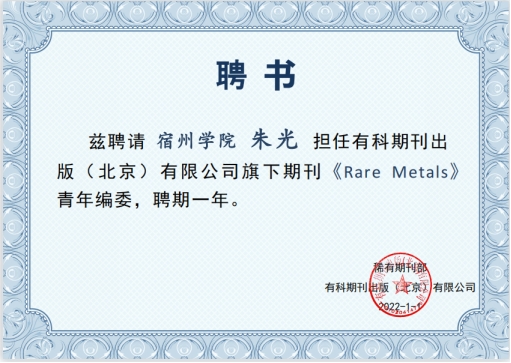 近日,中国科技期刊卓越行动计划入选期刊《稀有金属》(Chinese Journal of Rare Metals)、《稀有金属(英文版)》(Rare Metals)编委筹备委员会启动2021年青年编委会增补,经过编辑部初选、编委会推荐和讨论、主编审议环节,我校朱光教授成功入选《稀有金属(中、英文版)》青年编委。期刊编委扮演着期刊把门人的重要角色,把握着学科研究的热点,引领着学科研究的方向,对学科建设起着重要作用。我校教师的入选优秀学术期刊青年编委,将有助于提高学校材料学科的学术影响力,对促进省级一流学科建设有着重要的推动作用。