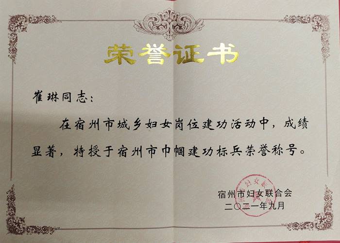 2021年9月,宿州市妇女联合会揭晓了市巾帼建功标兵获得者,我校崔琳老师荣获2021年度市“巾帼建功标兵”荣誉称号。