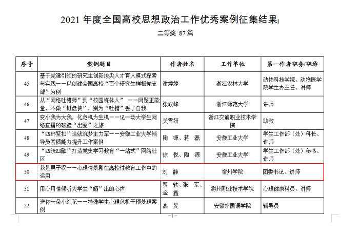 近日,由教育部思想政治工作司指导,《高校辅导员》编辑部主办的2021年度全国高校思想政治工作优秀案例征集活动评选结果正式公布。我校数学与统计学院辅导员刘静的案例《我是男子汉—心理情景剧在高校性教育工作中的运用》喜获全国二等奖。