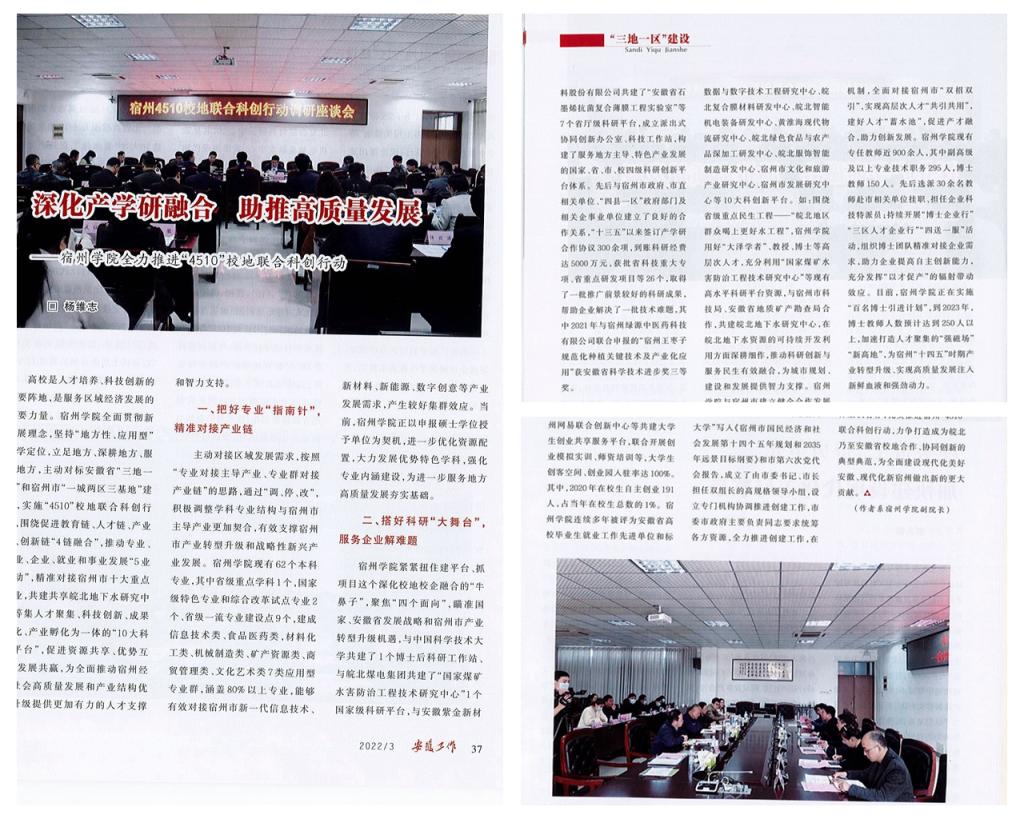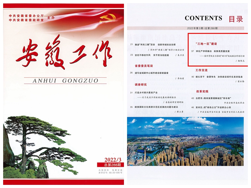 近日,《安徽工作》第288期刊登了我校副校长杨维志署名文章《深化产学研融合 助推高质量发展—大赢家体育全力推进“4510”校地联合科创行动》,现全文转载如下: