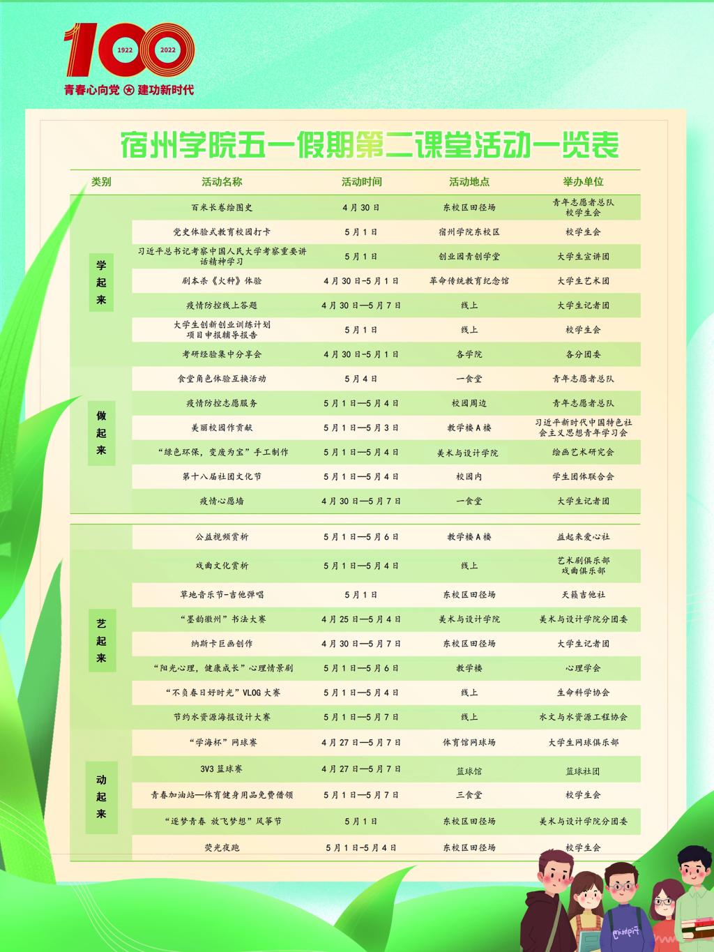 礼赞新时代,以“强国有我,请党放心”的青春誓言勇毅前行。青年媒体中心拍摄微视频《梦想课堂》,入选安徽共青团“百校接力唱百年”网络展示活动。为庆祝建团100周年,校团委于4月30日在东校区田径场举办了“喜迎二十大 百人共书画”百米长卷绘画活动。现场的百名同学们挥笔泼墨,以饱满的热情和认真负责的态度,使画卷更具艺术性,更有时代感。“百米长卷”活动的开展不仅在疫情期间丰富了同学们的校园文化生活,同时,作为学校共青团创新开展党史学习教育的重要形式,旨在教育引导青年学生从中汲取营养,用如磐初心凝聚奋斗伟力,以更加昂扬的姿态奋进新征程,建功新时代。