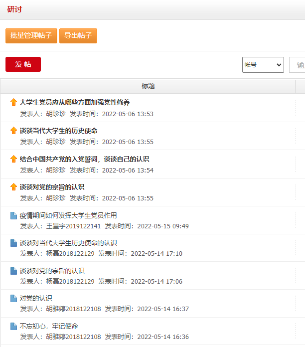 主题研讨环节主要围绕“当代大学生的历史使命”“对党的宗旨的认识”“大学生党员应从哪些方面加强党性修养”几个主题展开,在讨论的基础上继续形成书面思想汇报,作为本次培训的学习成果,学员们积极参与,研讨成果思想性强、主题鲜明、条理清晰、结构完整、逻辑严谨、内容详实。
