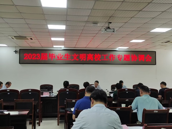 会议第一阶段,学工部部长李月云宣读了《大赢家体育做好2023届毕业生文明离校工作的通知》,对2023届毕业生文明离校工作进行了具体安排。相关职能部门分别就毕业生党团组织关系转接、就业、费用结算、图书归还、退宿、接送车辆安排、校园安全、宣传报道等工作进行了布置。