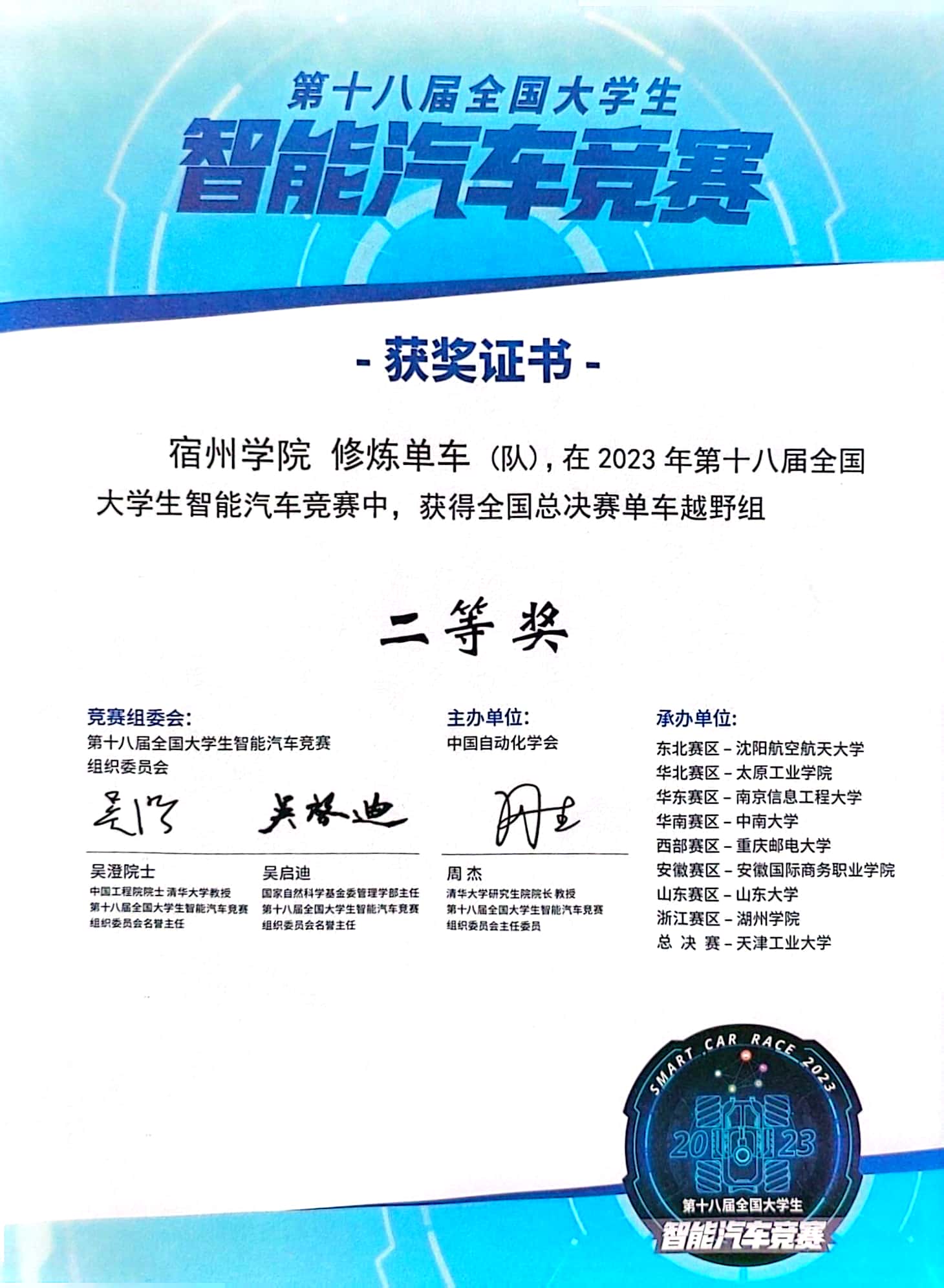 8月18日至19日,由中国自动化学会主办,天津工业大学承办的第十八届全国大学生智能汽车竞赛总决赛落下帷幕。大赢家体育机械与电子工程学院“单车越野组”取得全国二等奖的优异成绩,机械与电子工程学院自2020年以来(2022年暑期因疫情未参加比赛),连续3年在此竞赛中获得国赛奖项。