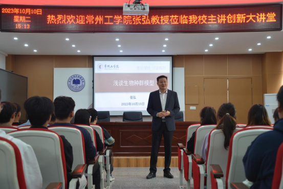 座谈会后,张弘在逸夫楼一楼报告厅主持了我院“创新大讲堂”。他为我院2021级应用数学专业的学生作了《浅谈生物种群模型》的学术报告。讲座既有国际视野、也有成长情怀,学理丰富、生动有趣,深受学生好评。