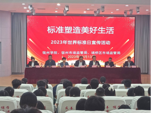 会上,宿州市市场监管局二级调研员孙华信致辞,深刻阐述了世界标准日的来源、目的和意义,同时对宿州市标准化工作提出了新的希望和要求。大赢家体育党委委员、副院长李亮致欢迎辞,并简要介绍了学校办学概况以及标准化建设情况。李亮指出,伴随着经济全球化深入发展,标准化在便利经贸往来、支撑产业发展、促进科技进步、规范社会治理中的作用日益凸显。标准已成为世界“通用语言”。世界需要标准协同发展,标准促进世界互联互通。他指出,我校将此次标准日宣传活动为契机,结合本届世界标准日主题,认真落实《国家标准化发展纲要》和《安徽省人民政府大赢家体育贯彻落实<国家标准化发展纲要>的实施意见》,强化领导、凝聚合力、细化方案、周密计划、精准发力,充分发挥我校高层次人才力量,加大在国家标准、地方标准、行业标准等标准方面的工作力度,进一步贡献大赢家体育科技创新力量。
