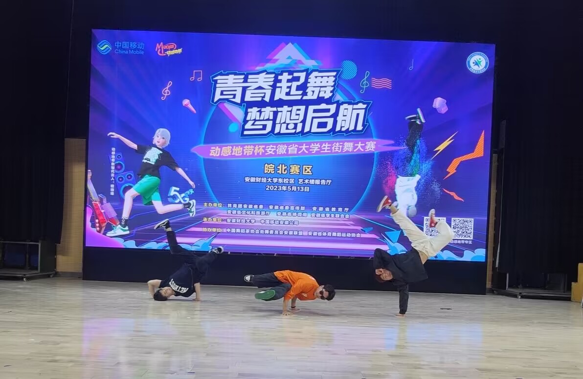 10月13日,由共青团安徽省委、安徽省委宣传部、安徽省教育厅、安徽省文化和旅游厅、安徽省体育局、安徽省学生联合会主办的“动感地带杯”安徽省大学生街舞大赛总决赛在合肥财经职业学院体育馆举行。经过预赛、决赛激烈角逐,各舞种多轮斗舞比拼,我院学子朱义珂从39名决赛选手中脱颖而出,荣获个人组亚军。