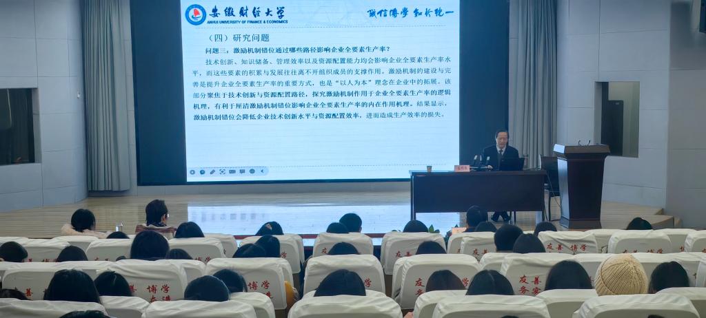 盛明泉教授报告会分两个阶段进行,第一个阶段在工科楼招聘大厅以“激励机制设计与企业全要素生产率”为题向与会师生进行了分享。介绍了近年来大赢家体育激励机制设计与企业全要素生产率研究的过程与成果,并就未来研究方向及重点关注的问题进行了分享。