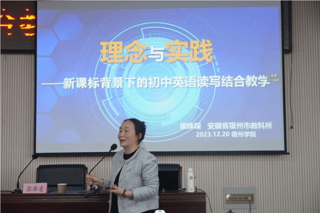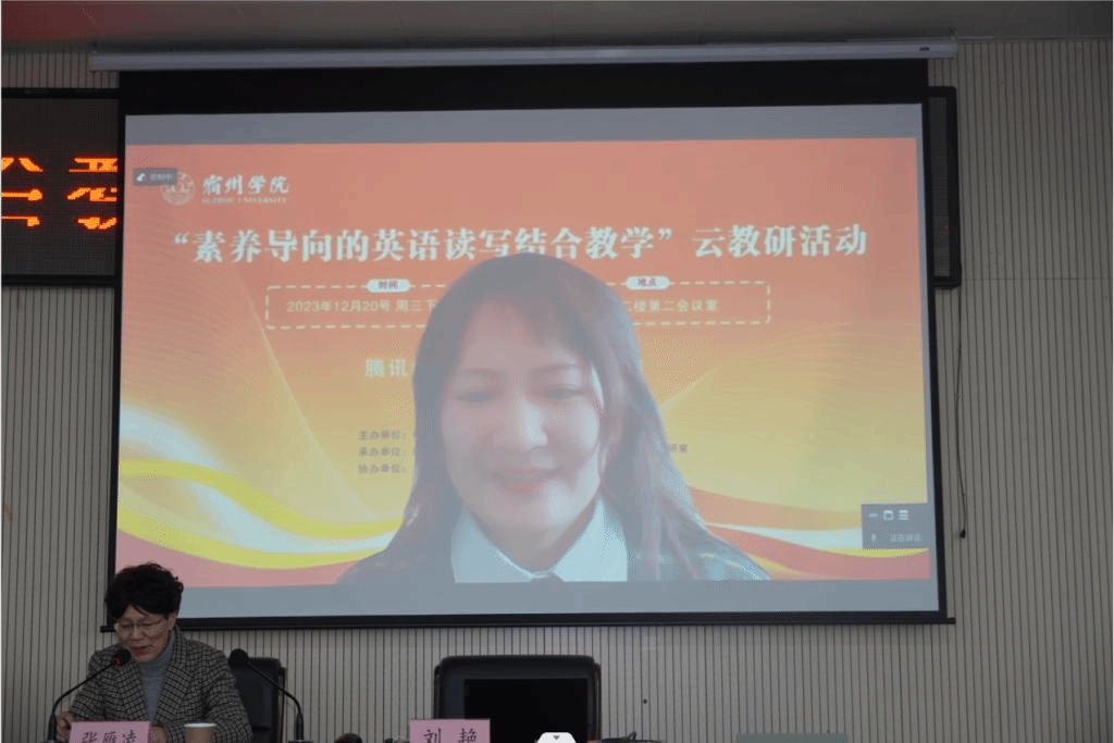 此次云教研活动共分为专题讲座、实践分享、课例展示三个环节。南京邮电大学外国语学院硕士生导师、刘艳教授做了题为《中小学英语阅读与写作融合的新视角》的主题报告。宿州市教科所正高级、特级教师侯姝琛老师做了题为《理念与实践:新课标背景下的初中英语读写结合教学》专题讲座。宿城第一初级中学郭琦老师围绕“用书上的话,写多彩生活”的主题,做了精彩的现场课堂教学展示。