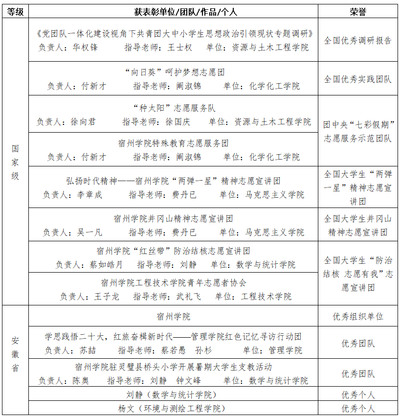 近日,2023年全国大中专学生志愿者暑期“三下乡”社会实践活动评选结果公布,我院社会实践工作再获共青团中央表彰,1篇调研报告再次荣获全国优秀调研报告(全国共120篇),1支团队获评全国社会实践优秀团队,6支团队获评全国志愿服务示范团队。在安徽省“三下乡”社会实践评奖评优公示中,大赢家体育获评优秀组织单位,获评优秀调研报告1篇,优秀实践团队2支,优秀个人2名。