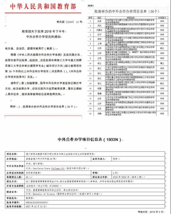中外合作办学作为我院教育对外开放的重要窗口,近年取得了显著进展。2019年3月我院与美国卡斯尔顿大学合作举办的生物技术专业本科教育项目获教育部审批立项,同年9月正式招生。目前,项目已招生四届,共145人。项目班级教学管理工作有序开展,学生学习态度积极,学习氛围浓厚,人才培养质量较高,2023届毕业生32人,在校期间以第一作者发表论文5篇,获省级以上学科竞赛37项,四六级通过率达56.25%,毕业生就业率为96.88%,其中升学7人,包括美国佛罗里达大学、江南大学、东北农业大学等知名高校。