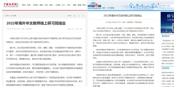 研习班为海外学员呈现了华文教师专业知识、课堂有效教学、家校共育、网络教学技术等精彩内容,让学员云端体验了黄山美景、徽州建筑、文房四宝、衣食住行等视觉盛宴,兼具实用性和趣味性,全面彰显了中华文化的深厚底蕴,充分展示了我院教师的风采。中国新闻网、中国侨网等社会媒体对研习班活动进行了多次报道。