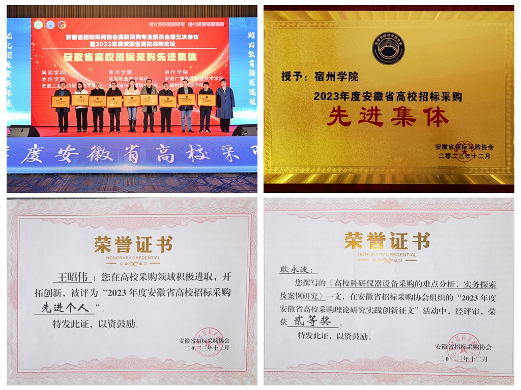 会议表彰了2023年度全省高校招标采购工作中表现突出的集体与个人。我院荣获“2023年度安徽省高校招标采购先进集体”荣誉称号,国资处王昭伟同志被授予“安徽省高校招标采购先进个人”,同时在安徽省高校采购理论研究实践创新征文活动中,学院选送的两篇论文经评审,分别荣获省级二等奖和三等奖。