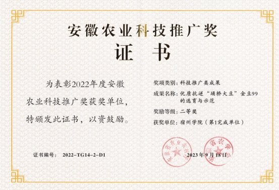 该团队针对安徽省大豆主产区面临的产量低、病虫害频发及成本高等问题,创建了集“抗病品种+栽培优化+生物防治+精准施药”于一体的绿色防控体系。此技术以良种选用、播种精细、密植合理、施肥科学等关键环节为核心,特别适用于皖北及黄淮海麦、豆一年两熟区,已在多地示范推广。该技术不仅解决了抗逆品种短缺、品质不佳等难题,还显著提升了大豆的水溶蛋白含量和售价,同时降低了化肥和农药用量,实现了增产增收和环保双重效益。王传之团队因此荣获2022年“安徽省农业技术推广奖”二等奖和2023年产学研合作创新成果优秀奖。