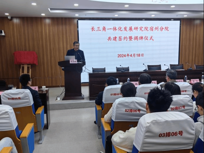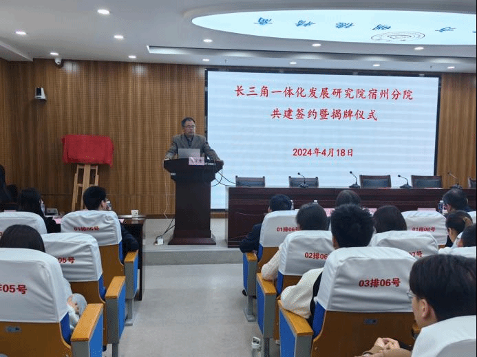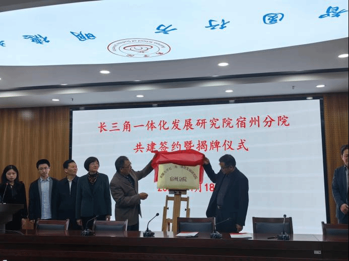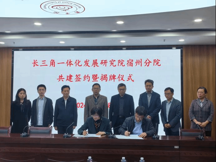 签约仪式中,陈得宝和何秋生共同为“长三角一体化发展研究院宿州分院”揭牌,刘红军和胡艳共同签订《长三角一体化发展研究院宿州分院共建协议》。
