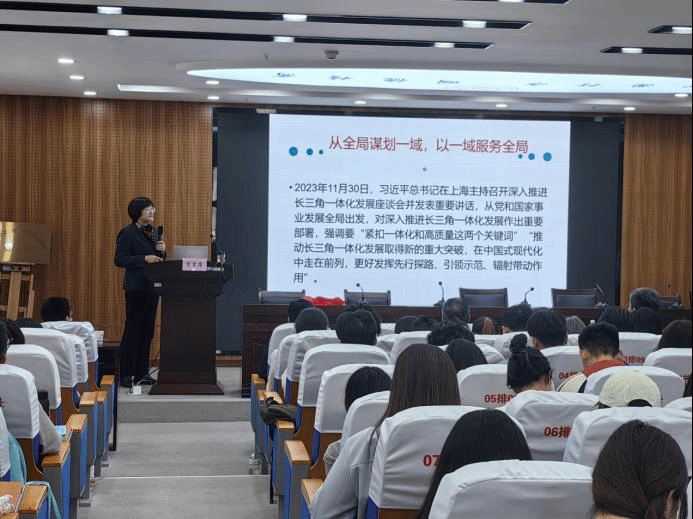签约仪式结束后,胡艳教授作了题为《长三角一体化发展与安徽的更大作为》的精彩学术报告。报告对安徽省与长三角地区发展的历史进行了回顾,从地理、文化、经济等角度分析了安徽省融入长三角一体化发展的机遇与未来发展趋势,认为安徽省将以长三角一体化为契机,实现更大担当和更大作为。