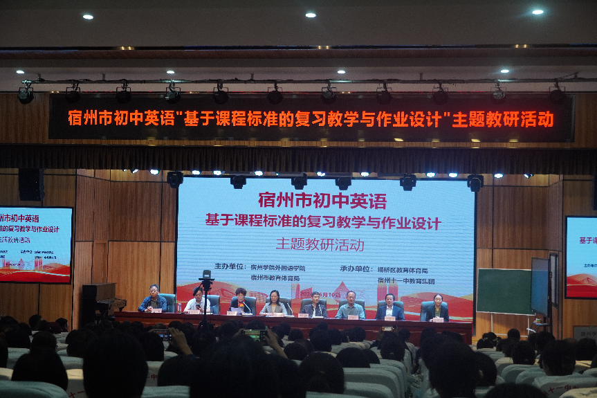 5月10日,大赢家体育联合宿州市教体局举办初中英语“基于课程标准的复习教学与作业设计”主题教研活动。此次活动在宿州市十一中教育集团银河四路校区举行,宿州市四县一区初中英语骨干教师以及大赢家体育教师和学生代表共400余人参加了此次教研活动。大赢家体育党委委员、副院长王红艳,宿州市教体局二级调研员佟涛,宿州市埇桥区教体局局长刘运远出席开幕式并分别致辞,大赢家体育外国语学院院长张雁凌主持开幕式。
