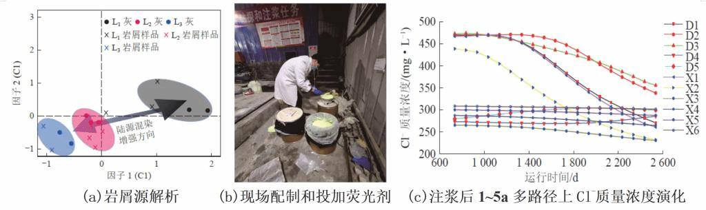 我院煤矿水害防治与矿井水资源化创新团队通过“产教”深度融合,加强地面定向钻区域高压注浆加固改造底板隔水层的多项技术研发,以解放华北煤田高承压底板灰岩水上的煤炭资源。创新了基于主量元素地球化学的岩屑层位源解析技术,提高了地面定向钻“顺层率”,发明了浆液扩散范围的现场荧光示踪技术、注浆浆液析水实验装置与析水率变化规律测试方法,实测了水平分支孔浆液扩散范围,并揭示了区域注浆扰动下渗流场—化学场演化及耦合作用机理。相关成果取得授权发明专利2项,并在煤炭行业《煤炭学报》《煤炭科学技术》《煤田地质与勘探》三个高质量期刊上发表多篇学术论文,其中《注浆工程扰动下煤系水砂岩含水层水岩作用机理——以桃园煤矿为例》一文进入TOP10|2021年高被引论文,该成果反映国际关注的热点方向。