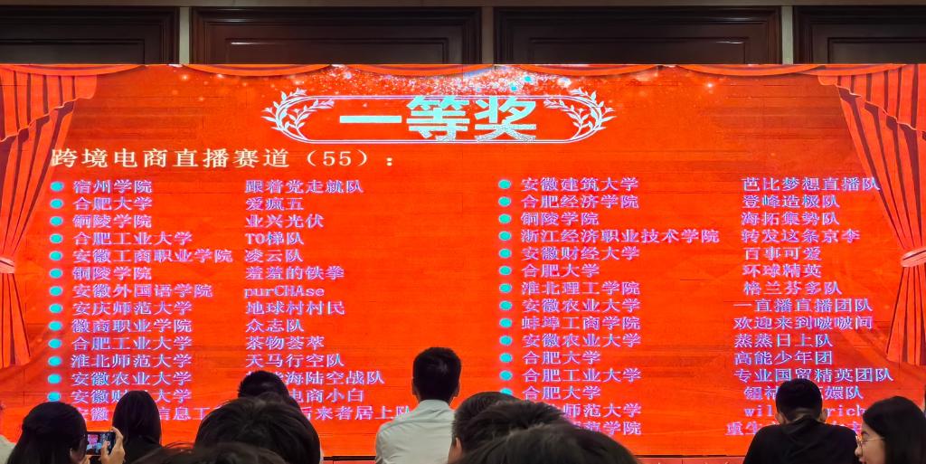 6月12日,由安徽省教育厅主办、安徽财经大学承办的2024年安徽省大学生国际贸易综合技能大赛在蚌埠利事环球酒店顺利举行。我校唯一一支晋级现场总决赛的由商学院孙阳博士指导的学生团队“跟着党走就队”在大赛的跨境电商直播赛道中荣获一等奖的优异成绩,且竞赛分数在全省排名第一。