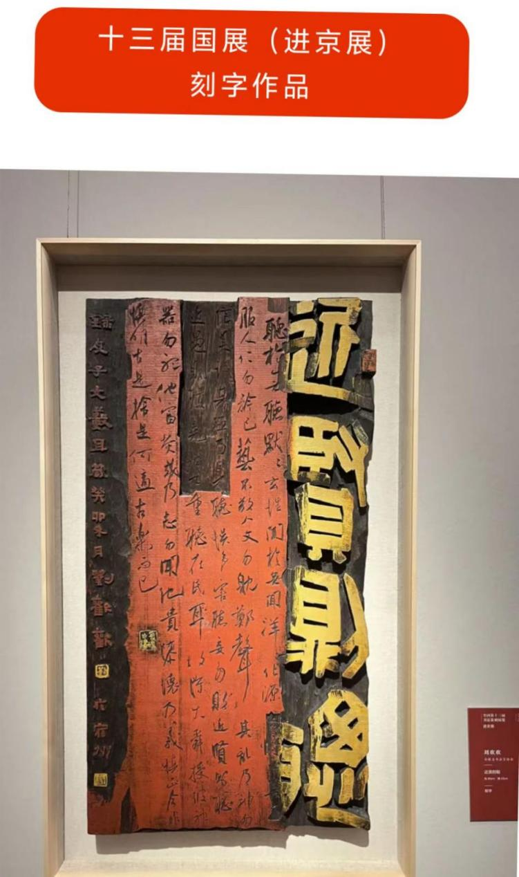 据了解,全国书法篆刻展览每四年举办一届,是由中国文联和中国书协主办的中国书法界最高规格的综合性展览,被誉为书法界的“奥林匹克”。全国第十三届书法篆刻展览从全国范围内征集了众多优秀作品,经过严格的初评、复评和终评环节,最终从17368件入围复评的作品中评选出965件入展作品,而进京展更是从这965件作品中精选出275件进行展出,全国刻字作品仅选9件进京展览。刘欢欢参展刻字作品——《近贤则聪》是在全国第十三届书法篆刻展览的基础上擢优选拔确定的。