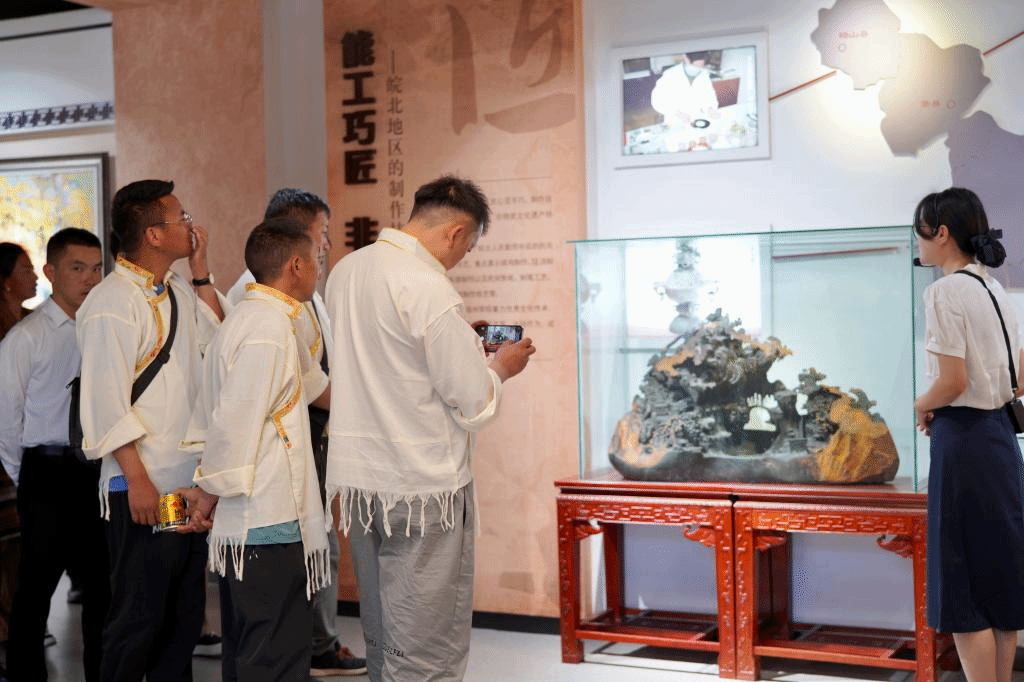 代表团成员一行还参观了皖北文化艺术馆,欣赏了皖北地区的孝文化、灵璧石、剪纸、字画、戏曲等,感受了浓厚的文化底蕴。随后,双方互赠了具有各自地方特色的民俗作品,包括团扇、刺绣、牛角梳、明信片等,展现了不同地域文化的独特魅力。