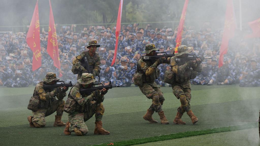 在军训总结汇报环节,各营新生代表组成的8个方阵,身穿戎装、英姿飒爽,迈着整齐的步伐,喊着铿锵有力的口号,依次走过主席台接受检阅。军训带训教官进行了刺杀动作、战术基础动作展示等,赢得了现场观众的阵阵掌声。
