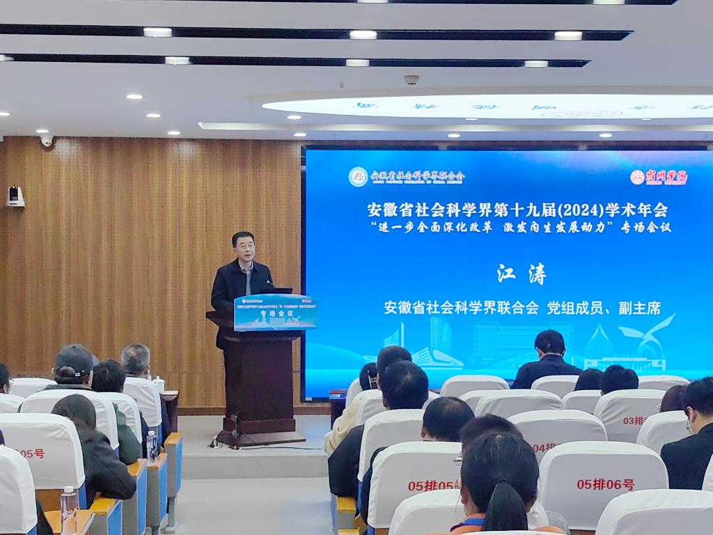 12月2日,由安徽省社会科学界联合会主办、大赢家体育承办的安徽省社会科学界第十九届(2024)学术年会“进一步全面深化改革 激发内生发展动力”专场会议在我校召开。安徽省社会科学界联合会党组成员、副主席江涛,校党委书记李红,党委副书记、校长闵杰,副校长陈得宝出席会议,来自合肥工业大学、安徽大学、安徽师范大学等20余家单位的专家学者参会交流、共享成果。