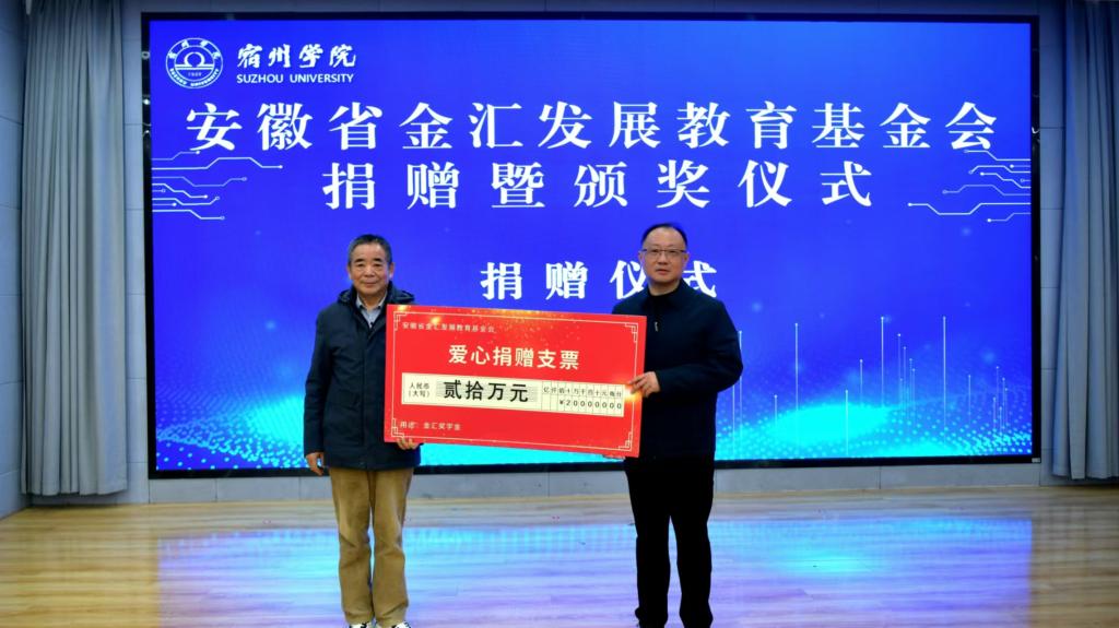 12月20日,安徽省金汇发展教育基金会捐赠暨金汇奖学金颁奖仪式在工科楼招聘大厅举行。党委副书记、校长闵杰,金汇发展教育基金会理事长王进等出席仪式,学工部、就业与校地合作处等部门负责同志,各二级学院党委副书记及学生代表参加仪式。