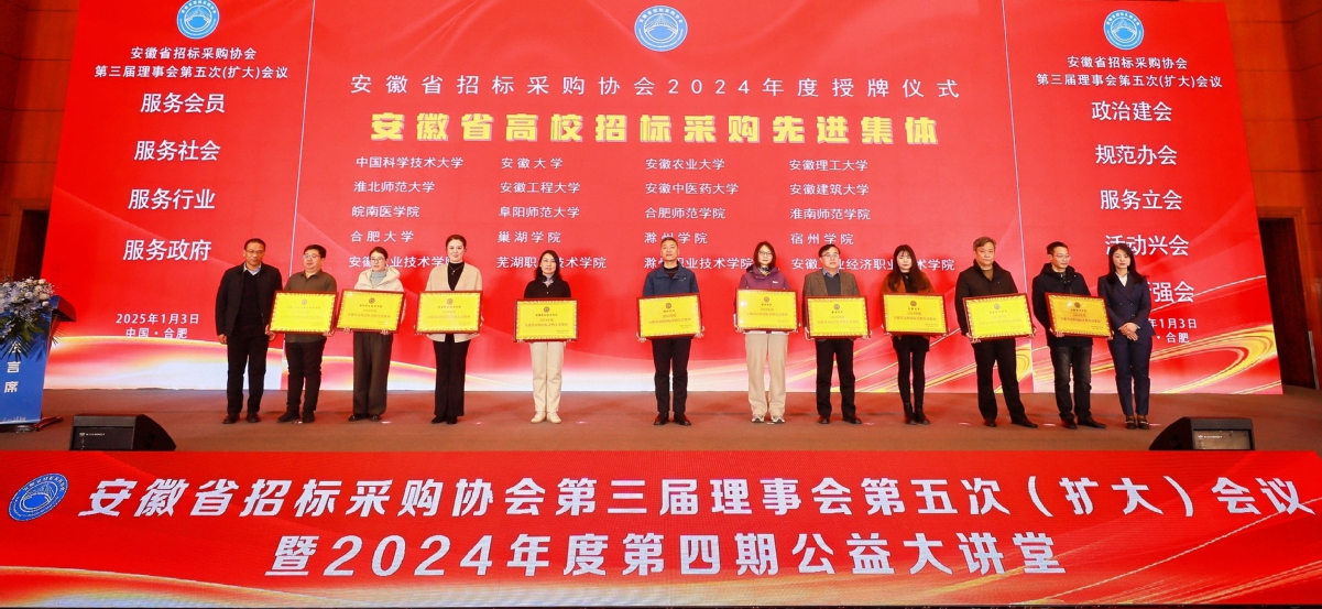近日,安徽省招标采购协会第三届理事会第五次(扩大)会议暨2024年度安徽省高校采购论坛在合肥召开,会议表彰了2024年度全省高校招标采购工作中表现突出的集体与个人,我校荣获“2024年度安徽省高校招标采购先进集体”荣誉称号,国资处招标采购科陈晓东同志被授予“2024年度安徽省高校招标采购先进个人”。