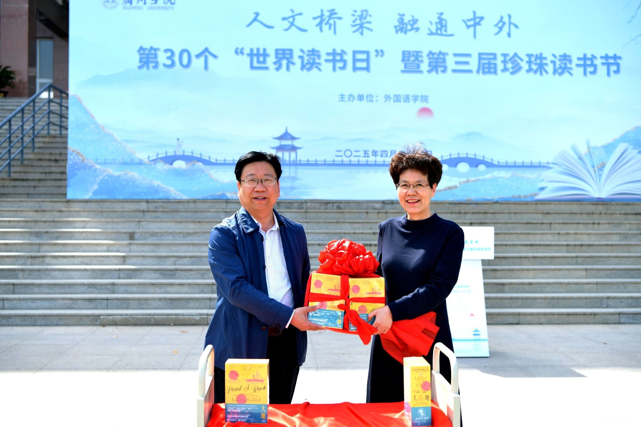 4月23日下午,我校举办2025年世界读书日暨第三届珍珠读书节开幕式,校党委副书记、校长闵杰,校党委委员、副校长杨维志出席,宿州市赛珍珠研究会和校党委宣传部、学工部、图书馆等部门主要负责人,以及外国语学院师生代表参加了活动。外国语学院党委书记郝景东主持开幕式。