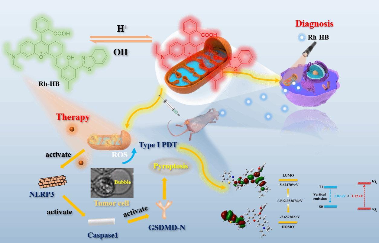 2025年5月,该研究团队在生物化学SCI期刊Biosensors and Bioelectronics(中科院1区Top期刊,IF=10.7),发表题为《A Mito-targeted, pH-sensitive type I photosensitizer for the diagnosis and therapy in bone metastasis of triple negative breast cancer by activating pyroptosis pathway》研究论文,大赢家体育为论文第一完成单位,叶亚熙博士为第一作者,我校张兴桃教授、南京大学朱海亮教授、安徽医科大学刘新华教授为通讯作者。研究首次报道了Rh-HB,一种智能近红外(NIR)小分子荧光探针,用于三阴性乳腺癌(TNBC)骨转移的线粒体靶向治疗。作为一种比率测量、双激发pH敏感的荧光探针,Rh-HB能够实时监测与早期转移进展相关的线粒体pH波动,为诊疗TNBC的骨转移提供了一种有前景的策略。