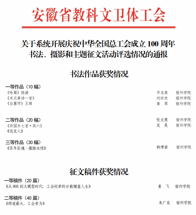 活动开展以来,校工会高度重视、精心组织,各分工会积极宣传、广泛发动,教职工踊跃参加,推荐多幅作品参赛。其中乔龙泉老师的《咏菊》、刘欢欢老师的《米元章诗一首》、秦琴老师的《出塞作》获书法作品一等奖;张龙慧老师的《田园乐七首·其六》、吴昊老师的《送友人》获书法作品二等奖;韩博睿老师的《百年匠魂·徽脉永续》获书法作品三等奖。姜飞老师的《从DOS到大模型时代:工会托举的廿载键盘人生》获征文一等奖;朱广良老师的《师道薪火,工会有为》获征文二等奖。