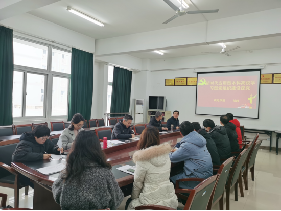 2020年1月3日下午,机电学院刘超教授在工科C楼三楼大会议室做题为新时代应用型本科高校学习型党组织建设研究的专题讲座。机电学院党总支委员,8个教师党支部书记参加。