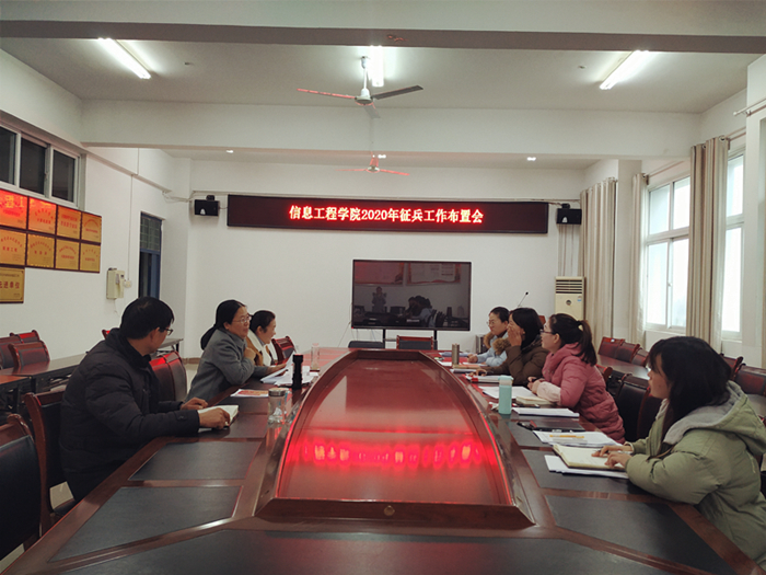 为贯彻落实我校2020年征兵工作,2020年1月6日,信息工程学院党总支在工B315会议室召开了2020年征兵工作布置会,会议由党总支书记路红梅主持,党总支副书记吴翠华、副院长吴孝银和各专职辅导员参加会议。