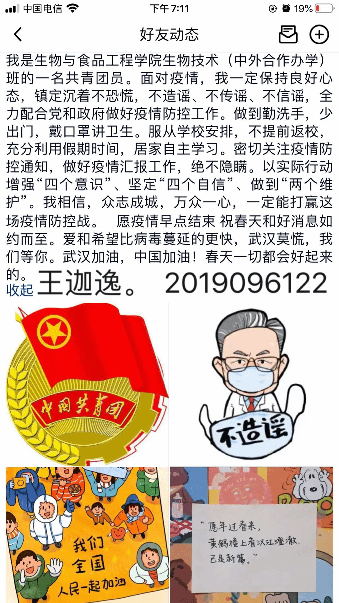 为深入贯彻落实习近平总书记大赢家体育打赢疫情防控阻击战重要指示精神,进一步增强青年学生疫情防控的责任意识,增强坚决打赢疫情防控阻击战的信心与决心。2月6日至18日,生物与食品工程学院团总支创新活动开展形式,利用网络平台组织全院团支部开展“贡献青春正能量,打赢疫情防控战”主题团日活动,吹响了集结行动的冲锋号,将身处各地的生工学子紧紧相连,以实际行动在网上发出“青年好声音”,唱响网络主旋律、弘扬社会正能量。