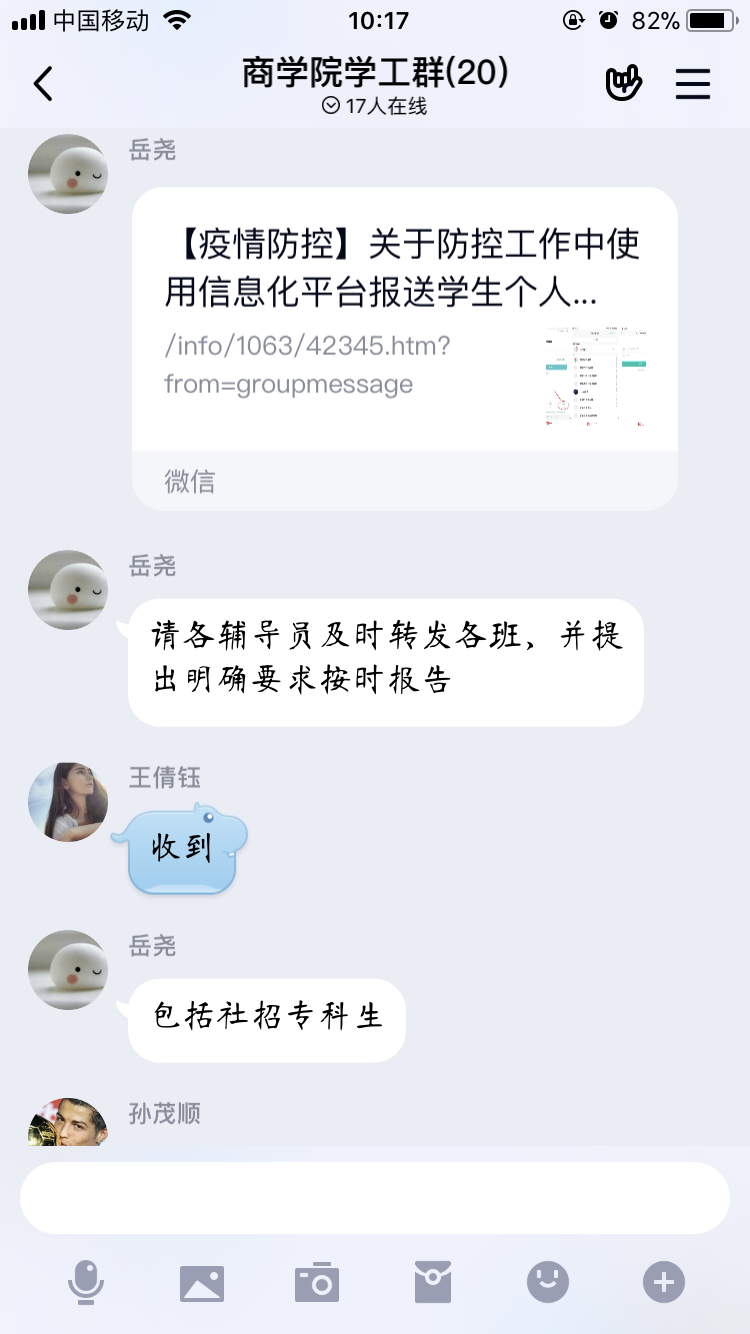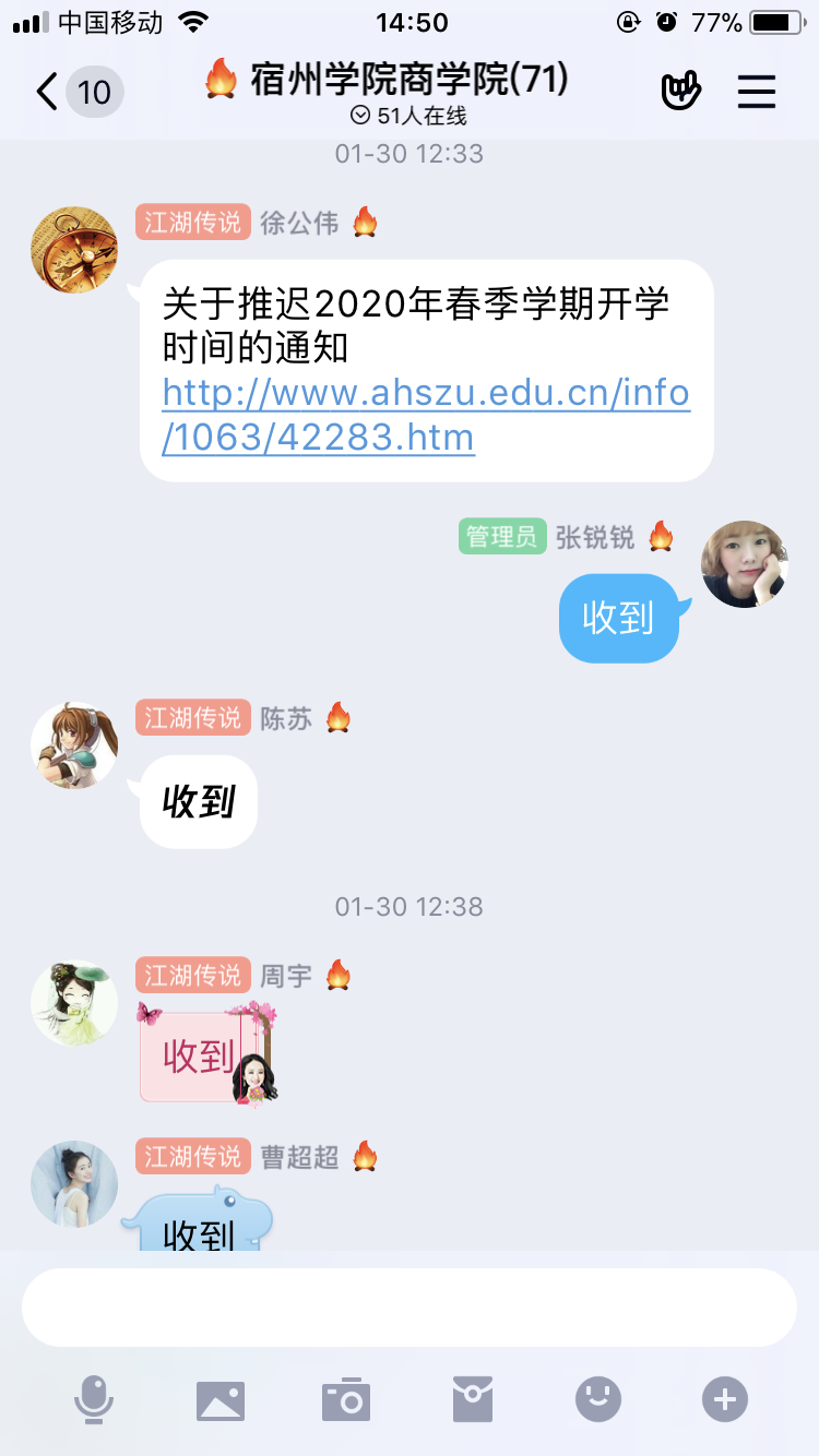 全员上阵,履职尽责,为打赢疫情防控阻击战贡献力量。学院党政办主任、党总支秘书、学生工作专干、辅导员等严格执行疫情“日报”制度,每天统计师生的身体健康情况、有无外出等动态信息,以及从湖北回皖的师生信息等,及时向学校相关部门进行汇报。全体师生积极响应支持,主动报告个人情况。辅导员认真督促学生每天登陆“今日校园”APP,填写“疫情每日一报”,掌握每位同学的寒假去向和即时状态,及时传达延迟开学、杜绝提前返校等通知要求。对于目前滞留湖北或实习单位等特殊情况的学生,积极跟踪关注、做好心理疏导。实训中心、团总支、就业工作专员等积极做好疫情期间学生实习管理、志愿者和就业服务工作。教学科研秘书按照教务处“大赢家体育应对疫情做好我校2020春季学期在线课程教学的通知”精神,制订了《商学院大赢家体育应对疫情期间教学工作方案》,鼓励教师开展网络直播授课,利用优质网络平台资源积极开展混合式改革,做好网上答疑、论文指导等,保证疫情防控期间教学工作正常开展。广大教师积极配合落实,及时加入2020春季网络教学群,认真做好网上教学各项准备工作,以实际行动坚决支持打赢疫情防控阻击战。