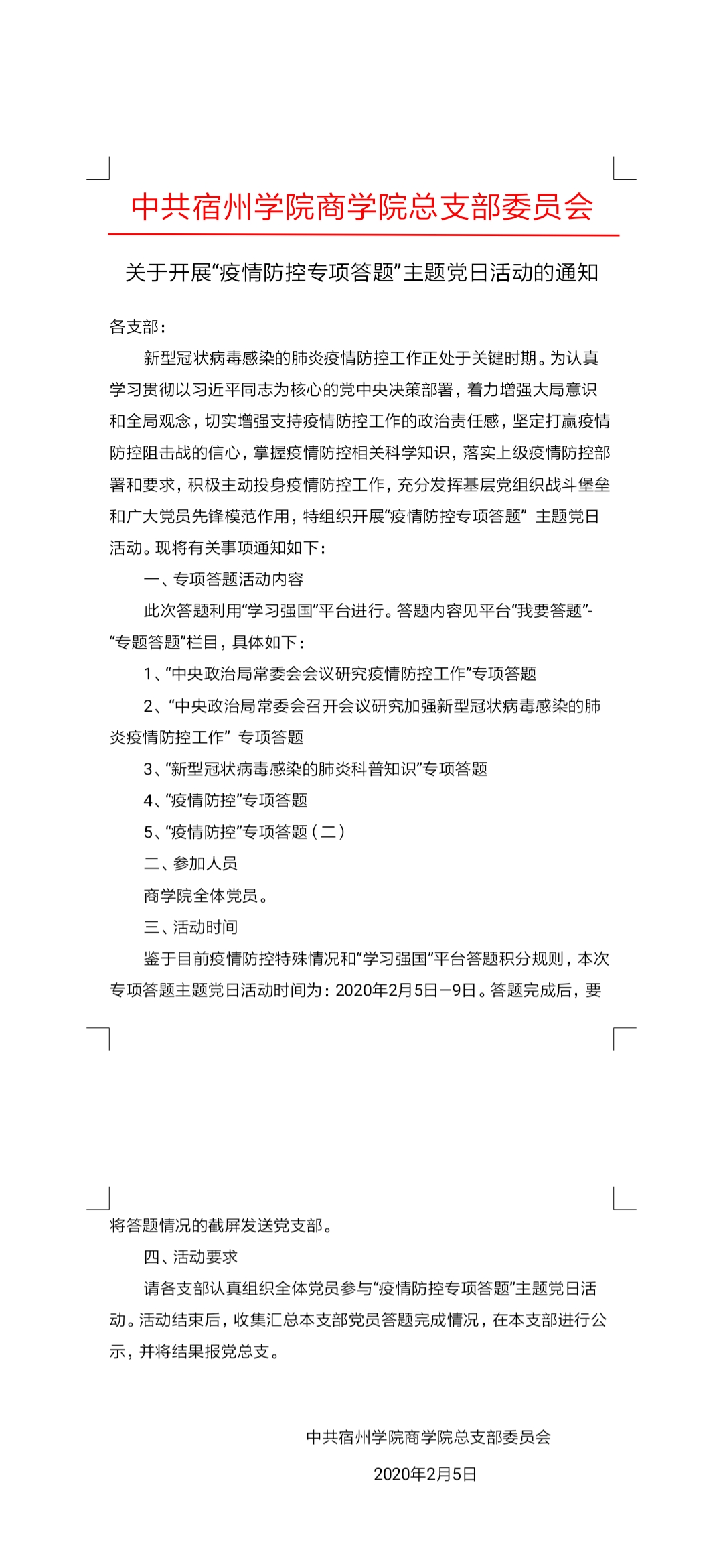 新冠肺炎疫情防控阻击战打响以来,商学院认真学习贯彻以习近平同志为核心的党中央决策部署,按照学校党委部署和要求,及时成立疫情防控工作领导小组,全力做好各项疫情防控工作,各基层党组织、广大党员以实际行动践行初心、勇担使命,团结带领教职工全员上阵,全力支持,为打赢疫情防控“阻击战”做出积极贡献。