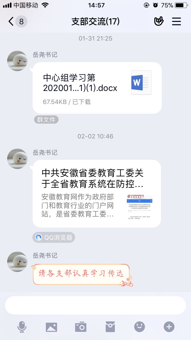 加强宣传学习,切实把广大党员和师生思想统一到中央决策部署上来。通过党建工作群、学院工作群、辅导员工作群、班级群及电话等方式,及时传达学习习近平总书记大赢家体育新型冠状病毒感染的肺炎疫情防控工作重要指示精神、学校疫情防控工作部署和要求,宣传新型冠状病毒防控科普知识,做到学习宣传覆盖全体师生。广大党员和师生坚定信心,增强责任,自觉落实各项防控措施,用实际行动支持中央决策部署。