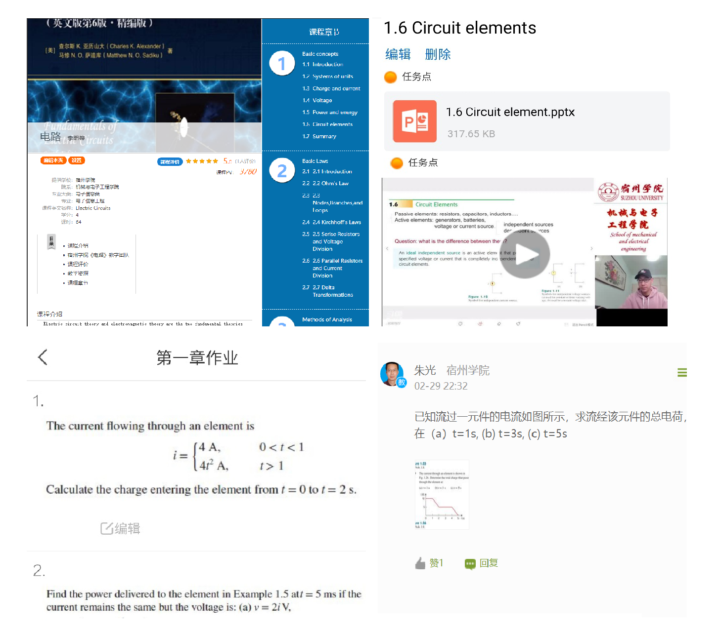 本课程为双语教学,教材和PPT为英文版。为线上保障教学效果,教学团队在安徽省网络课程中心平台,上传了《电路》的大规模在线开放课程(2018MOOC385)视频。这套MOOC为中文讲授,讲授重要概念与重难点的知识点,便于同学们在课后使用较短时间复习和补充提高。两套资源相辅相成,确保教学质量。同时,为了避免线上教学突然增多导致网络堵塞,教学团队准备了斗鱼直播和QQ群作为预备方案,并将其作为线上答疑的平台使用。