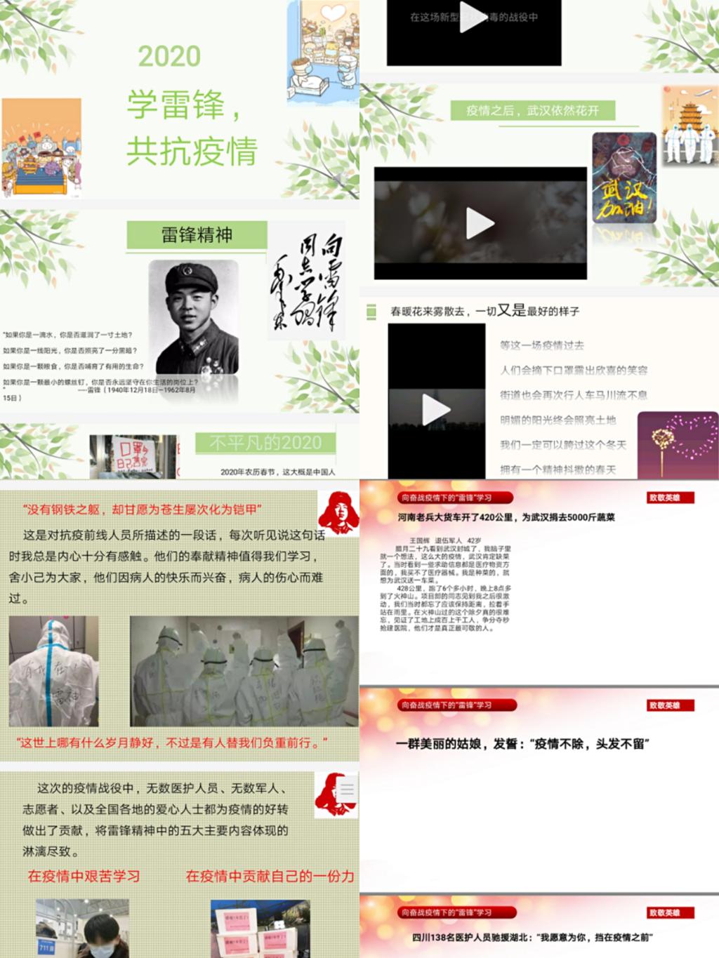本次“雷锋月”系列活动由PPT制作、歌词改编和短视频征集三个活动组成。在活动期间,同学们积极响应学习雷锋精神的号召,踊跃报名参加各项活动。正值疫情期间,参赛人员带着对身处抗疫一线的白衣天使和工作人员们最美好的祝愿,制作出一张张美观精致的幻灯片、改编出一首首动人心弦的歌词、剪辑出一段段精彩绝伦的短视频,以优秀的作品热情歌颂这场战“疫”中的“雷锋”同志们,表达出对他们深深的敬意。最后,经过评委们的公正评判,负责人在各项活动的活动群中公布了获奖名单。