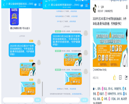 线上携手抗疫防痨,守护健康呼吸。2020年3月24日是第25个“世界防治结核病日”。机电学院组织爱·公益志愿者小队开展“携手抗疫防痨、守护健康呼吸”结核防治知识活动。活动分为在线答题、海报宣传两个部分。3月16日上午,机电学院通过到梦空间和微信客户端积极开展线上答题活动,同学们在微信端识别二维码参与答题。3月24日,活动发起了结核病防治主题海报转发活动,让身边的人更好地了解肺结核防治知识,增强自我防护意识和能力。活动累计覆盖人数近1500人,营造了积极参与结核病防治的良好氛围。