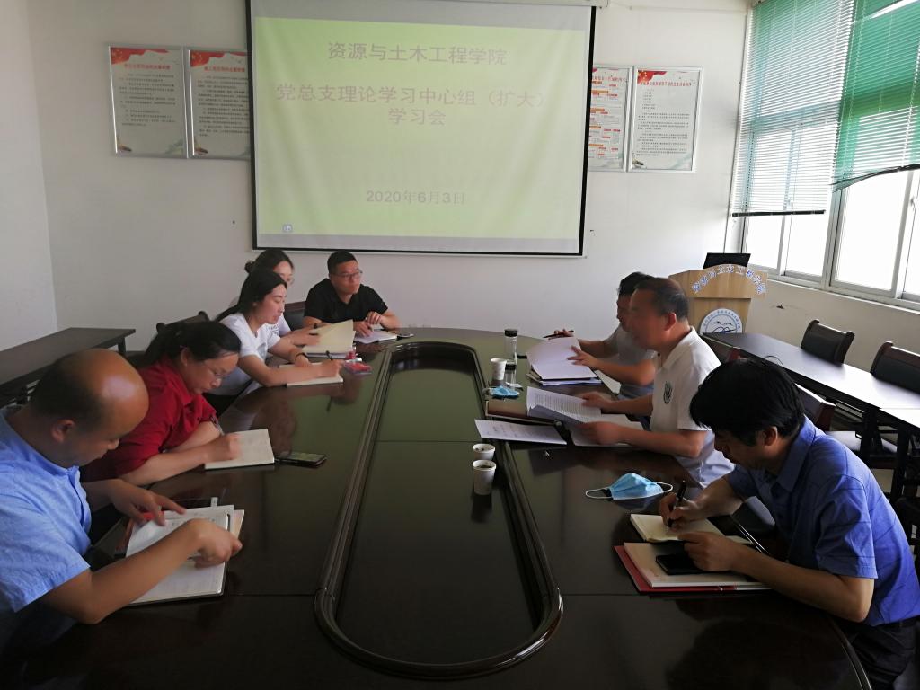 6月3日下午,资源与土木工程学院党总支在三楼会议室召开理论学习中心组学习会。学院党总支理论学习中心组成员、党总支委员、科级以上干部及支部书记参加会议,学院党总支书记刘领主持会议。